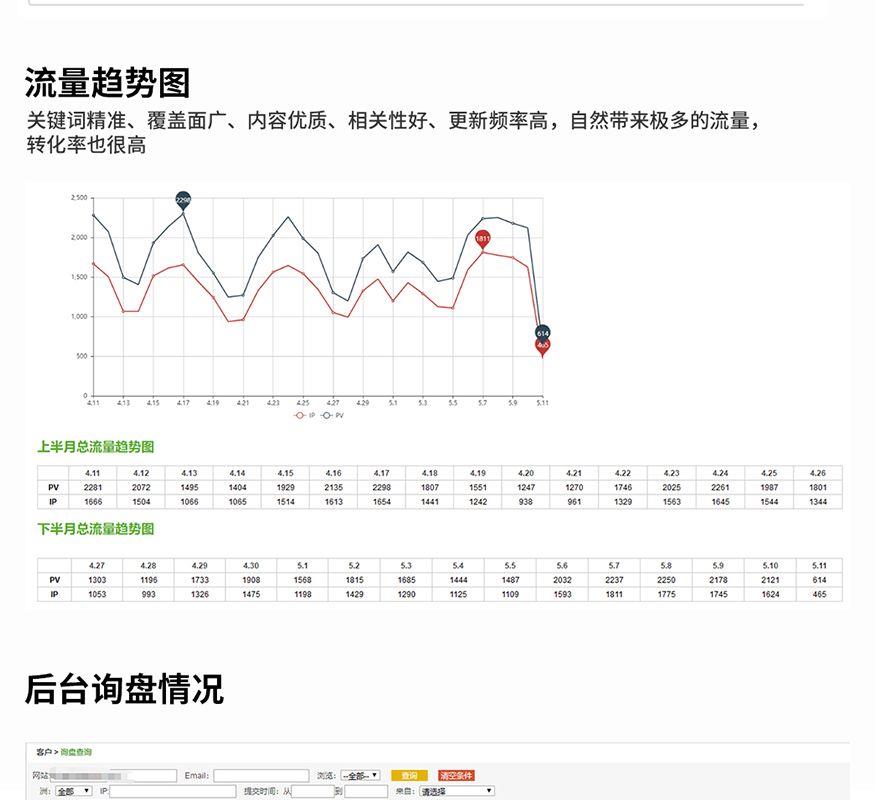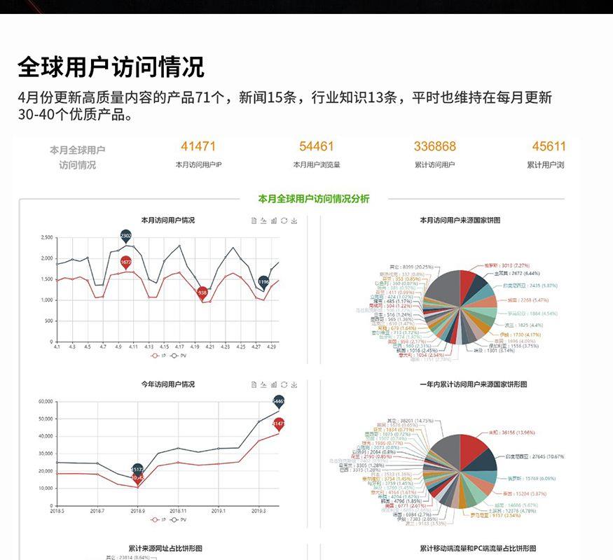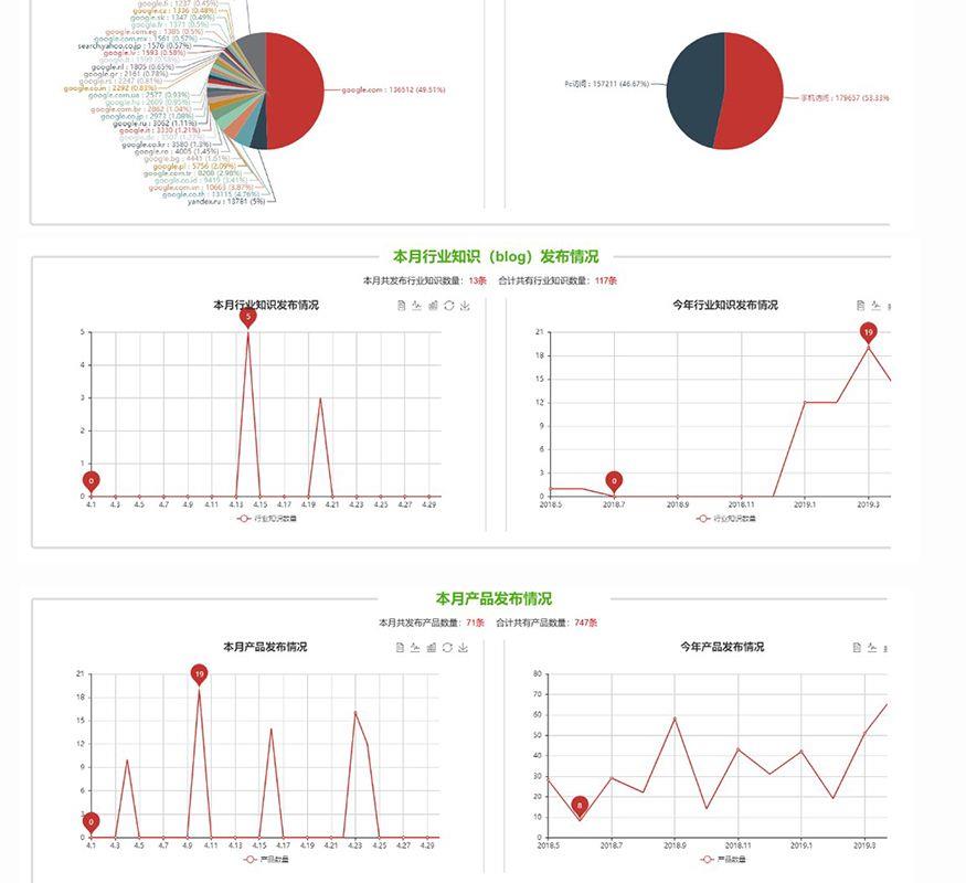 該客戶選擇的是外貿快車超級版A套餐,目前已合作2年,網站總達標天數701天。zui新排名在谷歌首頁的關鍵詞數量為1204個??蛻艉茏⒅鼐W站更新及運營情況,4月份,客戶共計更新高質量內容的產品71個,新聞15條,行業知識13條,平時基本會維持在每月更新30-40個優質產品。在這么多高質量的頁面帶動下,網站的日均流量可達到1500個以上,共計帶來1268個詢盤(不包含直接發郵件至郵箱的詢盤)。