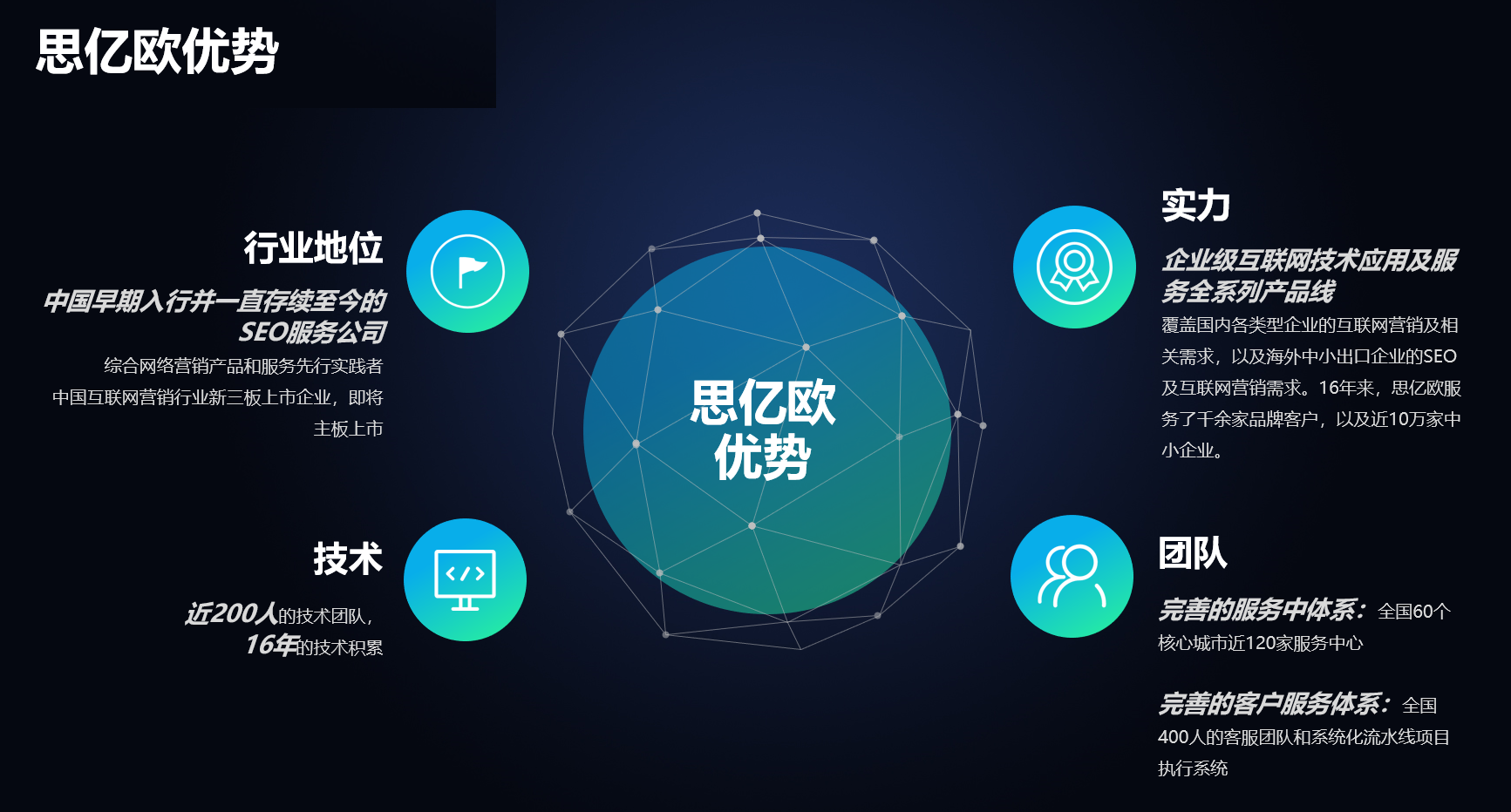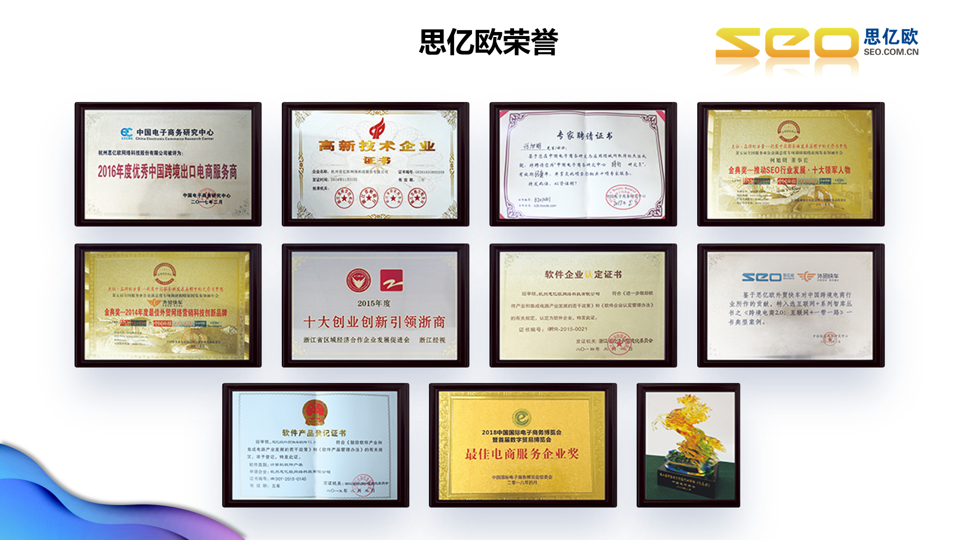 成立于2003年,致力于為中國各類型企業提供互聯網技術應用產品和服務,是國家高新技術企業、新三板掛牌企業(股票簡稱:思億歐,股票代碼:839255)。16年的從業經驗,思億歐建立了自主一體化的技術體系,積累了堅實的的技術實力和客戶基礎。如今,思億歐擁有企業級互聯網技術應用產品線:外貿快車、億企寶、沸客社交營銷軟件、整站優化、領真VR軟件。