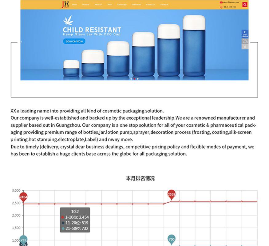 深圳網(wǎng)絡(luò)推廣公司-思億歐服務(wù)中心的Google優(yōu)化案例客戶是提供各種化妝品包裝解決方案的品牌企業(yè)。公司以卓越的領(lǐng)導(dǎo)為后盾,是一家知名的制造商和供應(yīng)商,總部設(shè)在廣州。我們公司是您所有化妝品和藥品包裝的一站式解決方案,提供優(yōu)質(zhì)的瓶子、洗液泵、噴嘴器、裝飾工藝(結(jié)霜、涂層、絲網(wǎng)印刷、燙印、電鍍、標(biāo)簽)和更多其他服務(wù)。