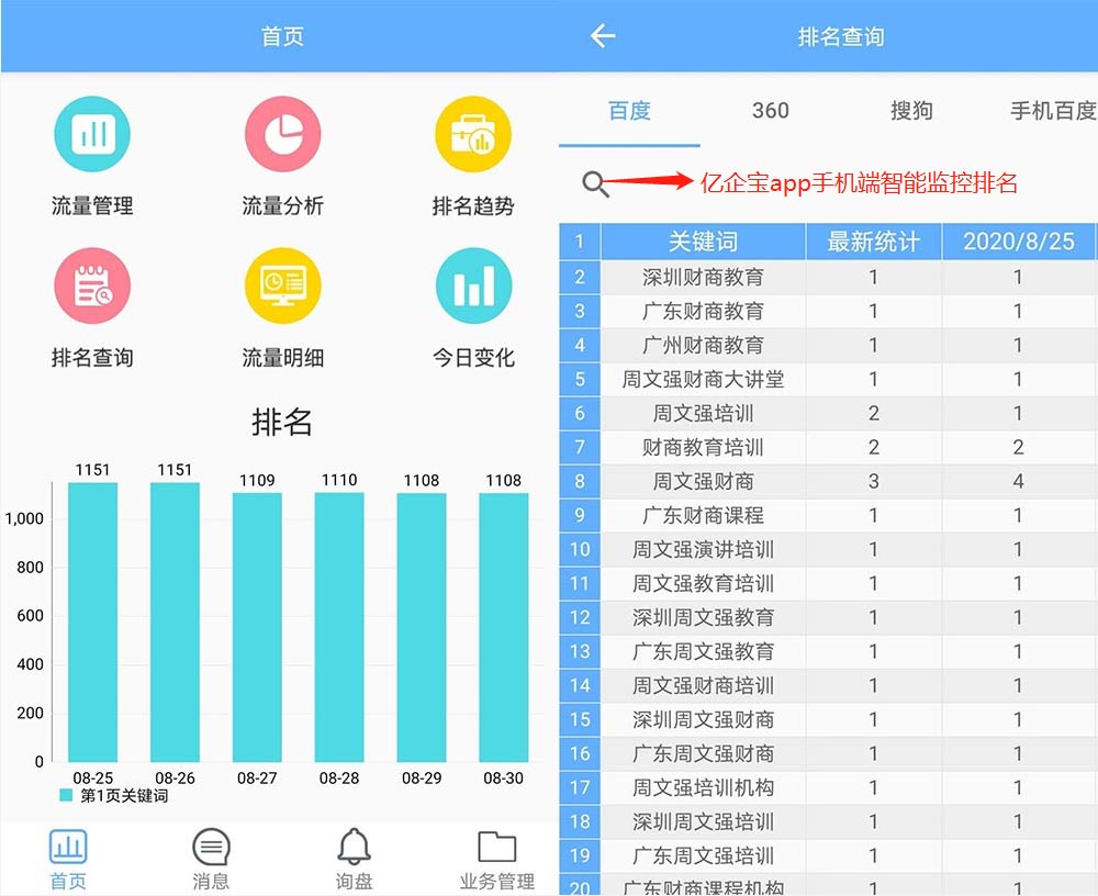 億企寶App:隨時隨地查看和管理關鍵詞排名、流量、訪問來路、詢盤,與客戶實時溝通互動。